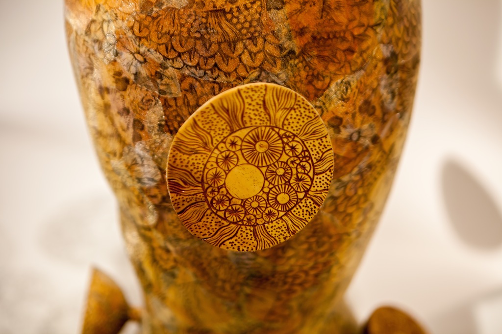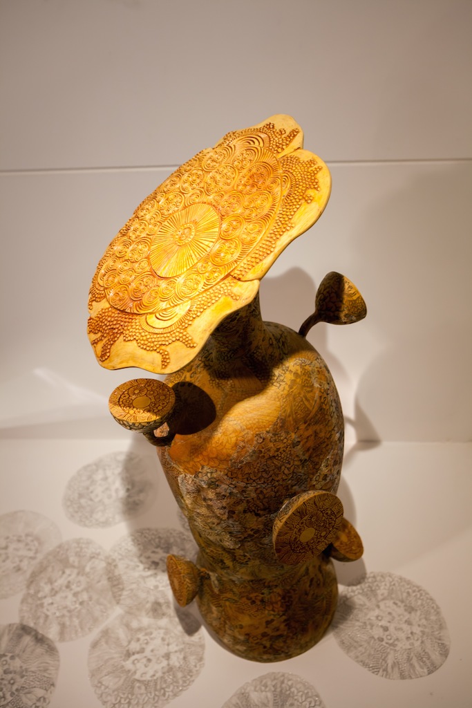 Hai tác phẩm điêu khắc của Trâm Kha là hai diễn tả khác nhau về dòng suối gỗ. ‘Khắc vào kí ức’ là một bản khắc gỗ lớn hai mặt, trông tựa tấm hóa thạch cổ của một loài hoa thanh tú được tìm thấy giữa dòng chảy; trong khi ‘Mọc dai dẳng’ có vẻ như một sinh vật hình người, kết hợp đường nét đầy đặn gợi cảm của người phụ nữ với một loài cây tương đồng hình dáng. Trong khi việc chạm khắc những tác phẩm này tốn nhiều thời gian, thì ngược lại, mỗi hình ảnh hiện ra là một khoảnh khắc duy nhất, một dấu ấn duy nhất. Như thể rằng, người nghệ sĩ đắm chìm trong thế giới tưởng tượng của cô để tìm ra khoảnh khắc mà cô có thể cảm nhận được nhịp điệu của dòng suối.